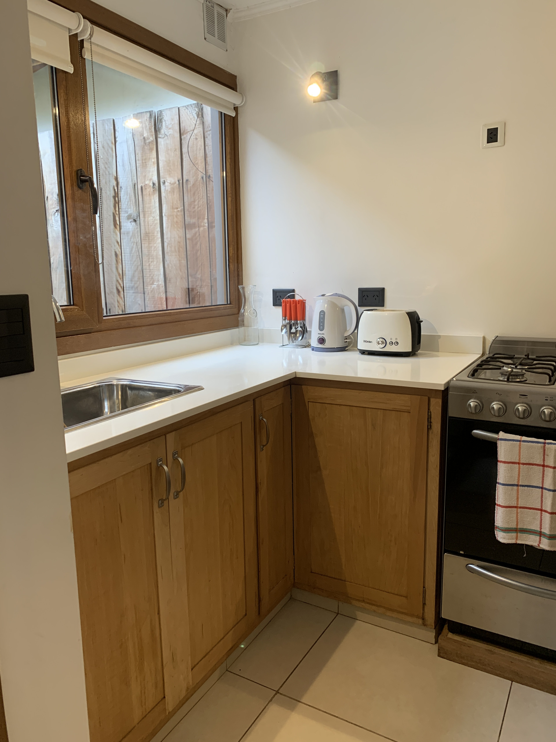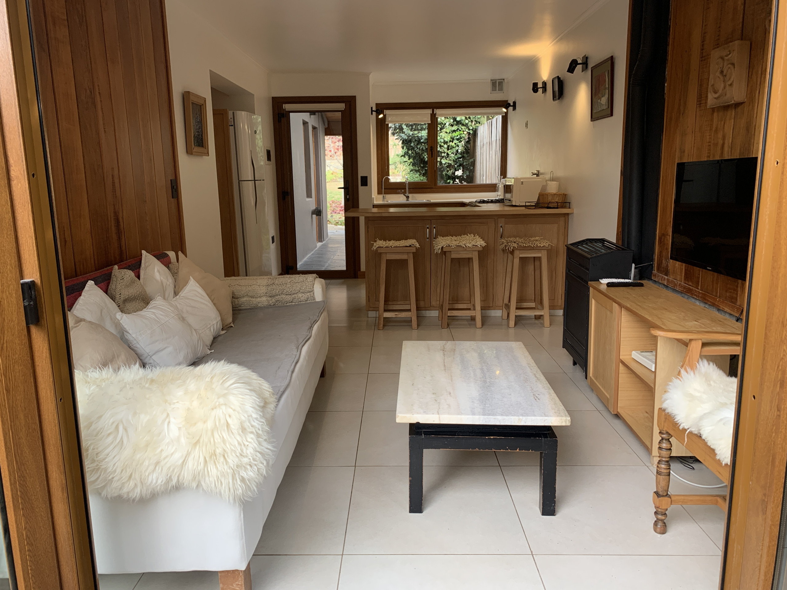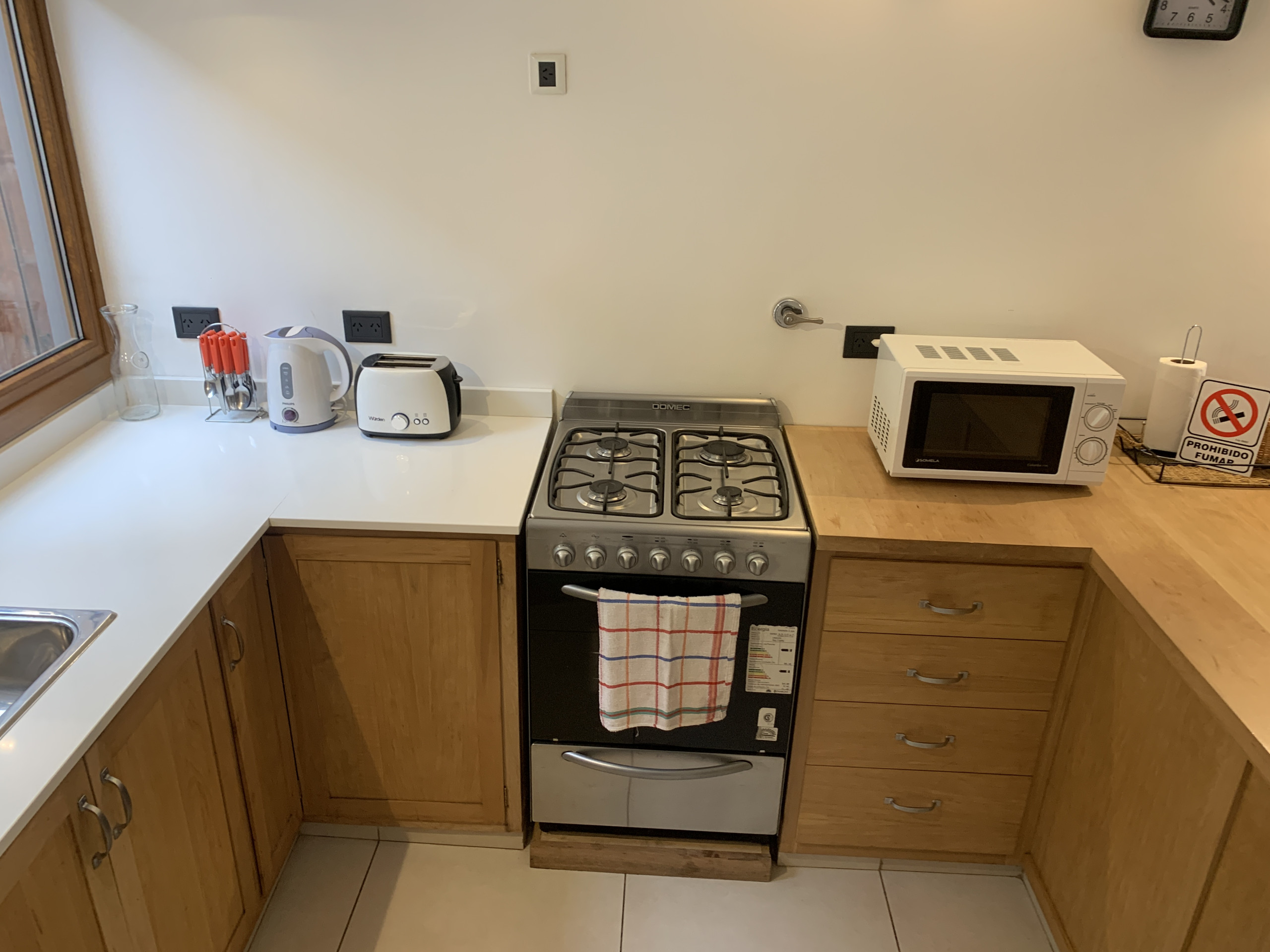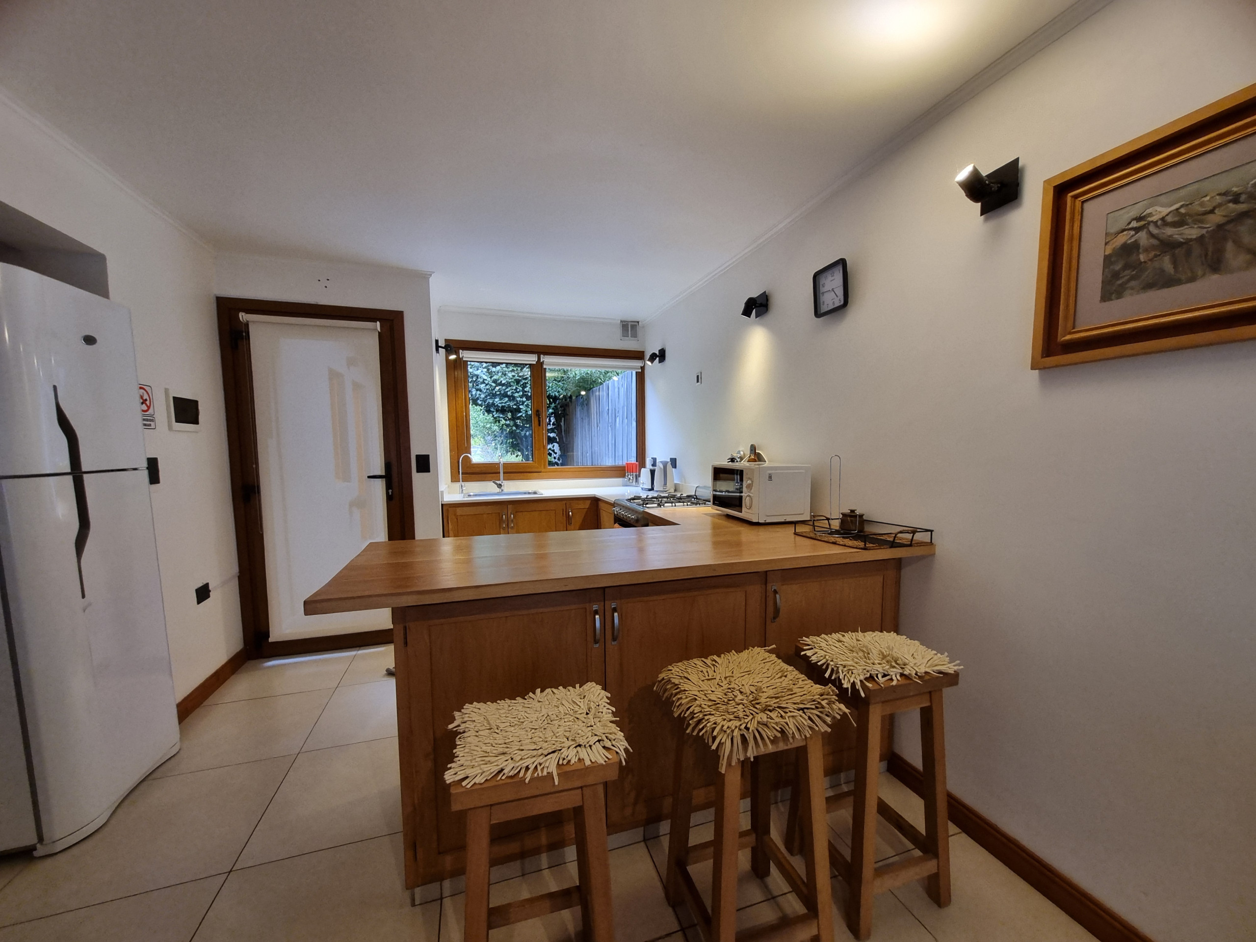 La cocina americana está completamente equipada con electrodomésticos de última generación, incluyendo heladera, freezer, cafetera, microondas, tostadora y hervidor. Es perfecta para preparar deliciosas comidas durante tu estadía. Además, cuenta con conexión WiFi, calefacción central y TV para mantenerte conectado y entretenido.