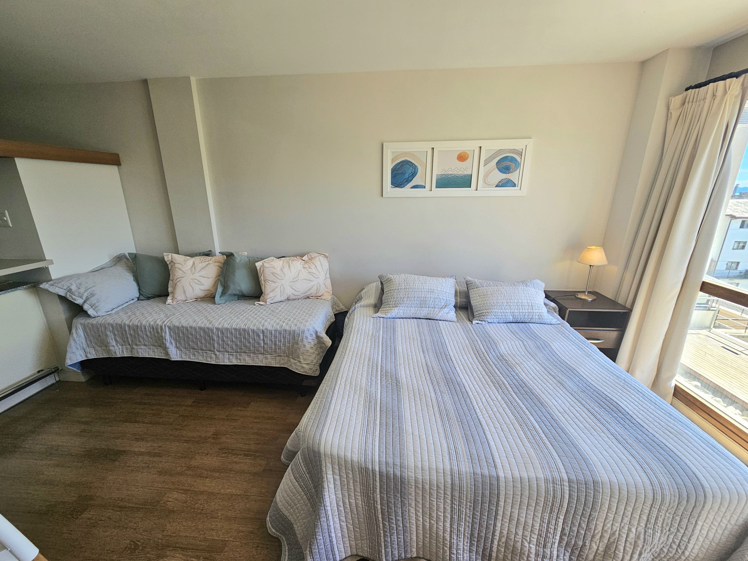 El departamento esta ubicado en pleno centro de Bariloche, es un monoambiente para dos personas moderno y con unas vistas increíbles a nuestro querido lago Nahuel Huapi cuenta con cama matrimonial o posibilidad de hacerla dos camas individuales, cocina completa mente equipada con microondas, tostadora, pava eléctrica, cocina a gas y todos los utensilios necesarios para que puedan cocinar. La calefacción del departamento es por radiadores. Baño completo con bañera.