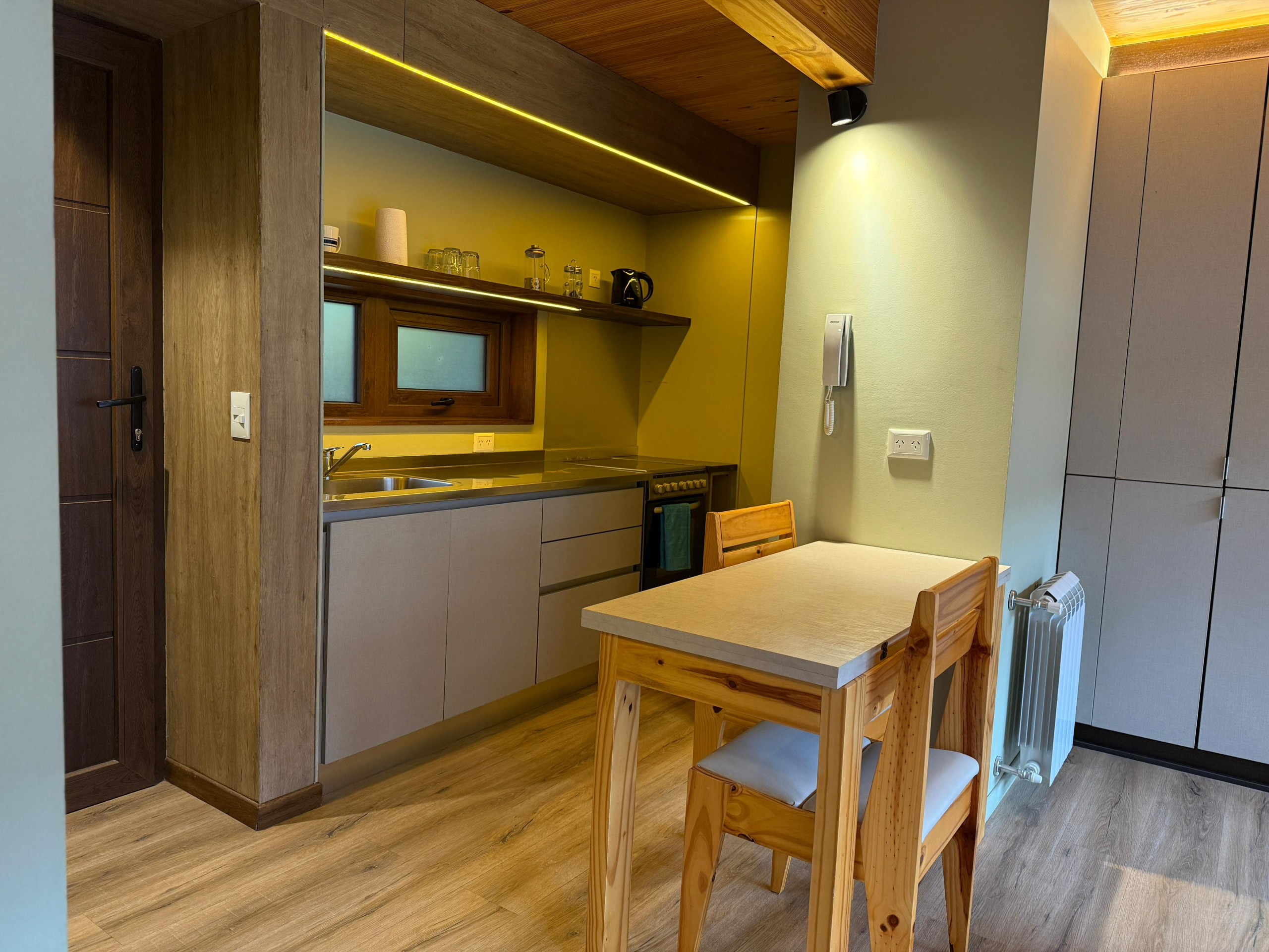 El apartamento cuenta con una cama matrimonial y está equipado con todas las comodidades necesarias para una estancia confortable. Disfruta de conexión WiFi de alta velocidad, calefacción central para los días más fríos y una cocina americana completamente equipada con electrodomésticos como heladera, microondas, cafetera, tostadora y hervidor.